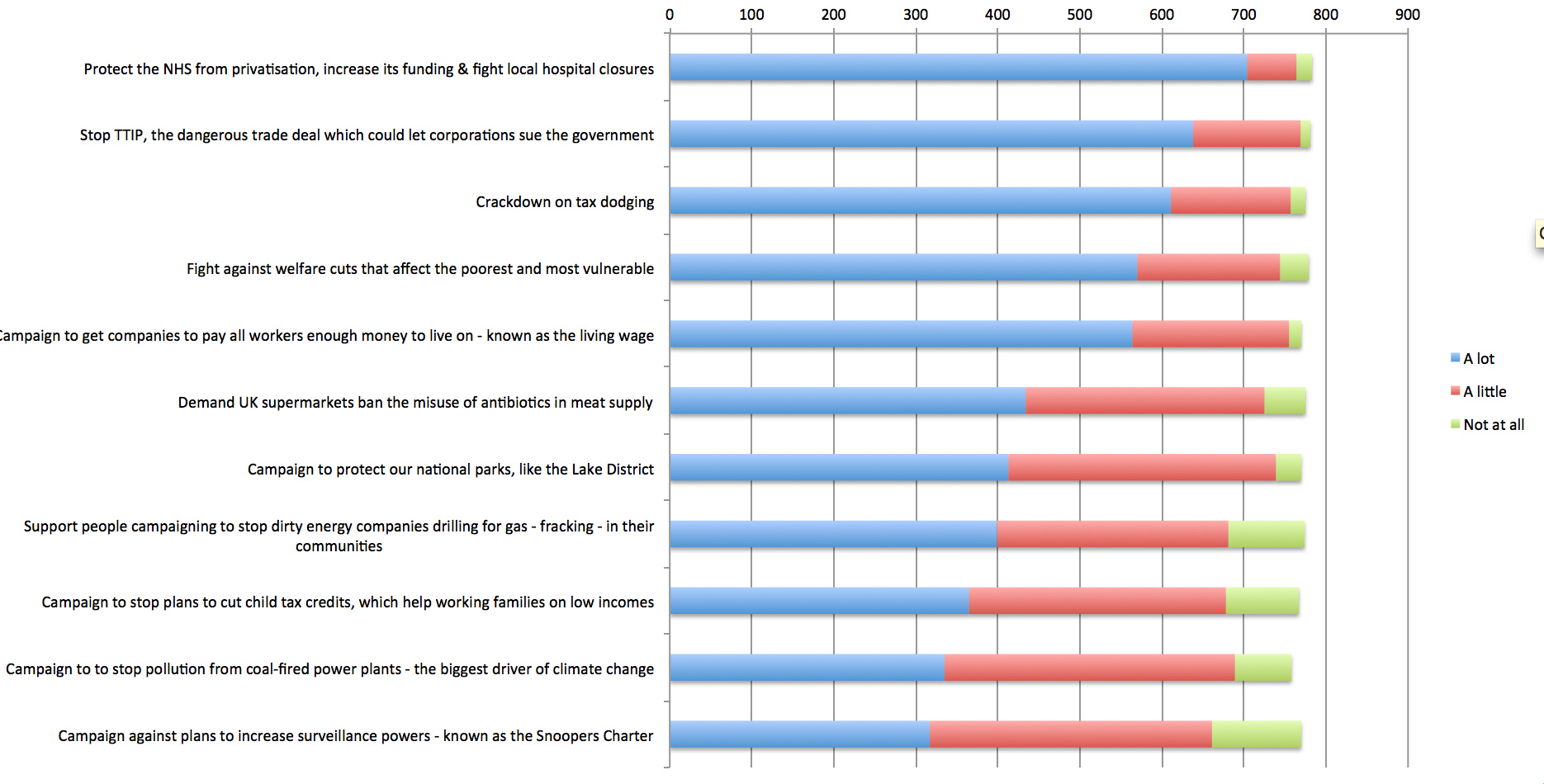 Our new government has big plans including more privatisation of the NHS and huge cuts to services and benefits. So 38 Degrees members have lots of campaigning ahead – and each week a group of us take a survey to help decide what we should prioritise.