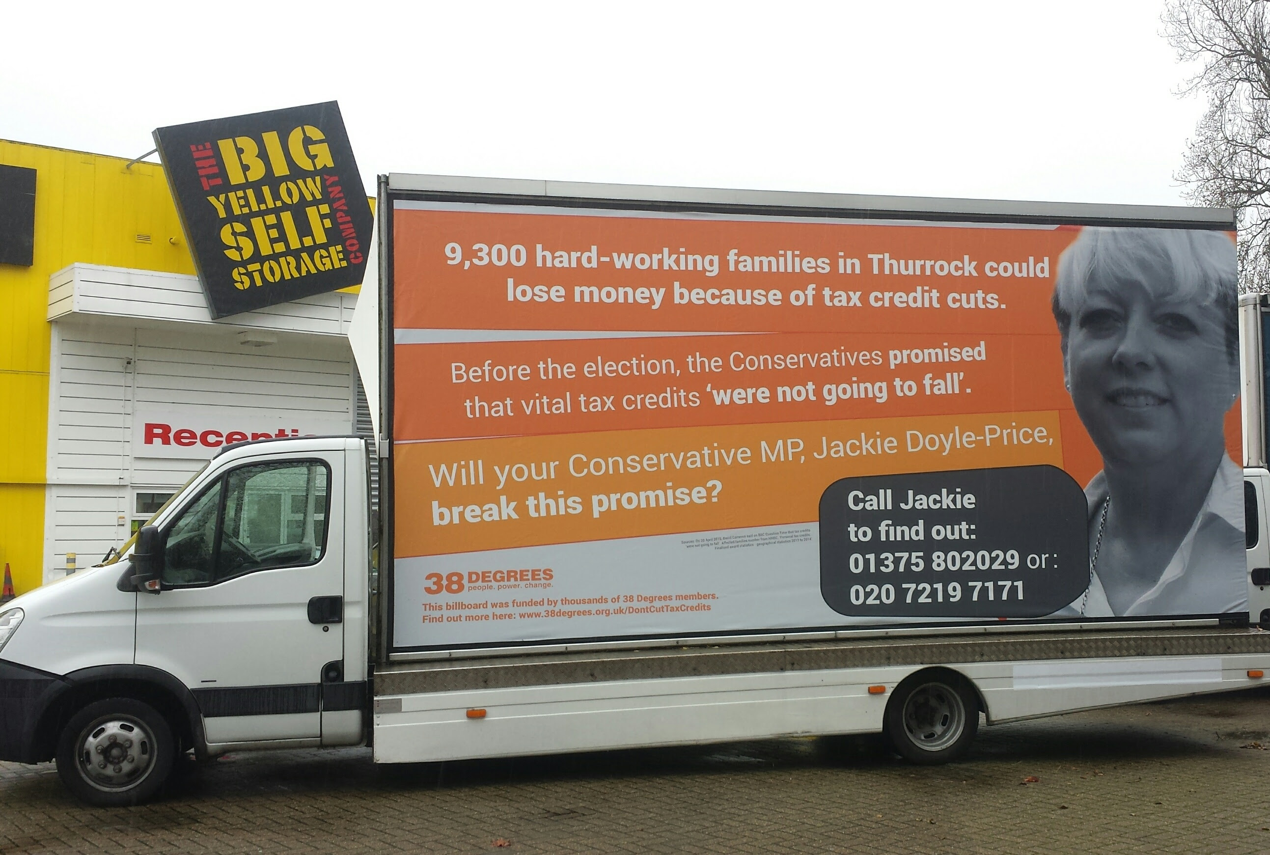 Have you seen these vans and leaflets around your town? 38 Degrees members have chipped in together to expose Conservative MPs for their position on Osborne’s devastating cuts. Check out the pictures below – and if you see the vans out and about please send your own photos to emailtheteam@38degrees.org.