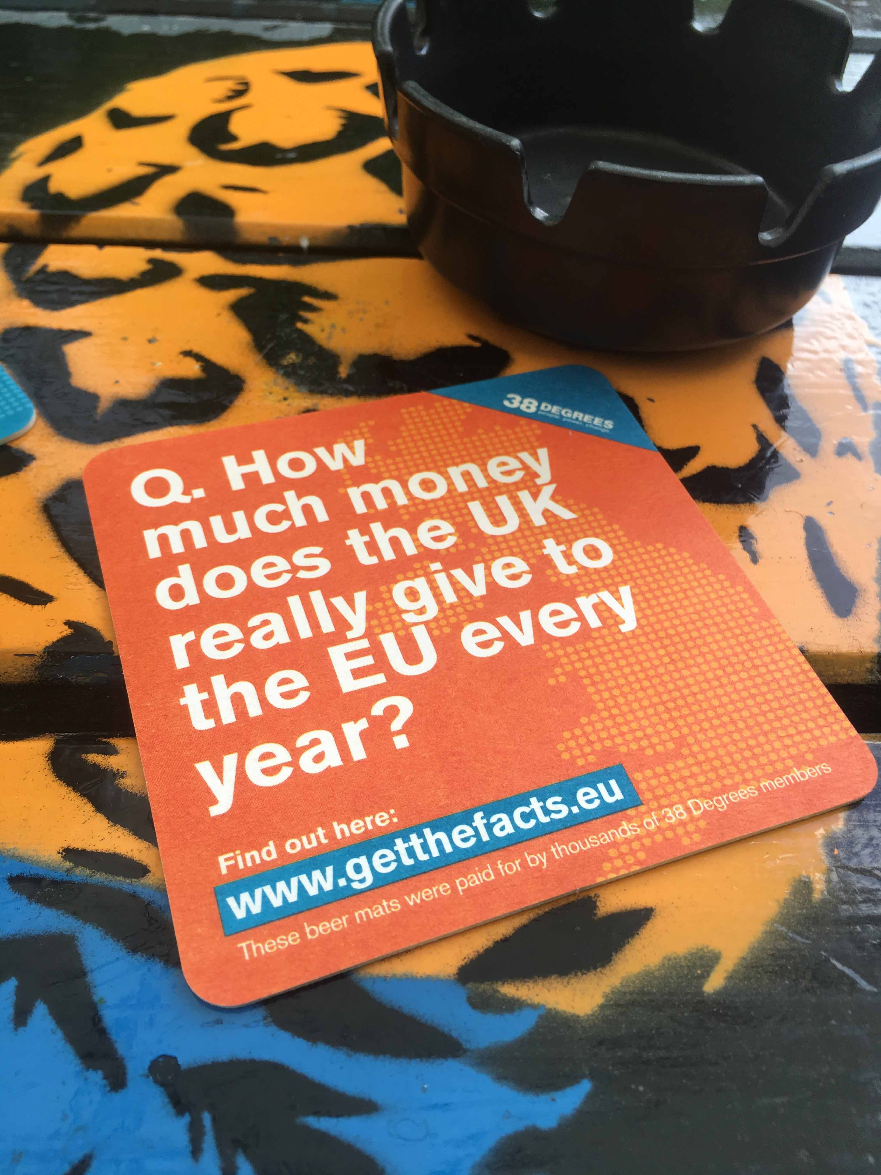 The EU Referendum is days away and it’s the topic on everyone’s lips. Thanks to 38 Degrees members chipping in together, thousands of independent, fact-covered beer mats about the EU are sitting on the tables of pubs up and down the UK