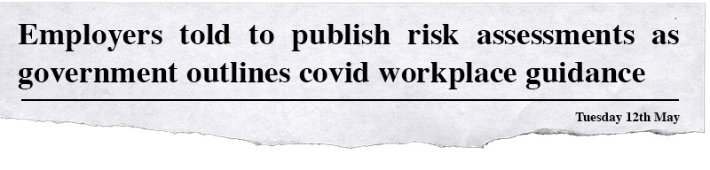 Image shows a newspaper headline, which reads: "Employers told to publish risk assessments as government outlines covid workplace guidance".