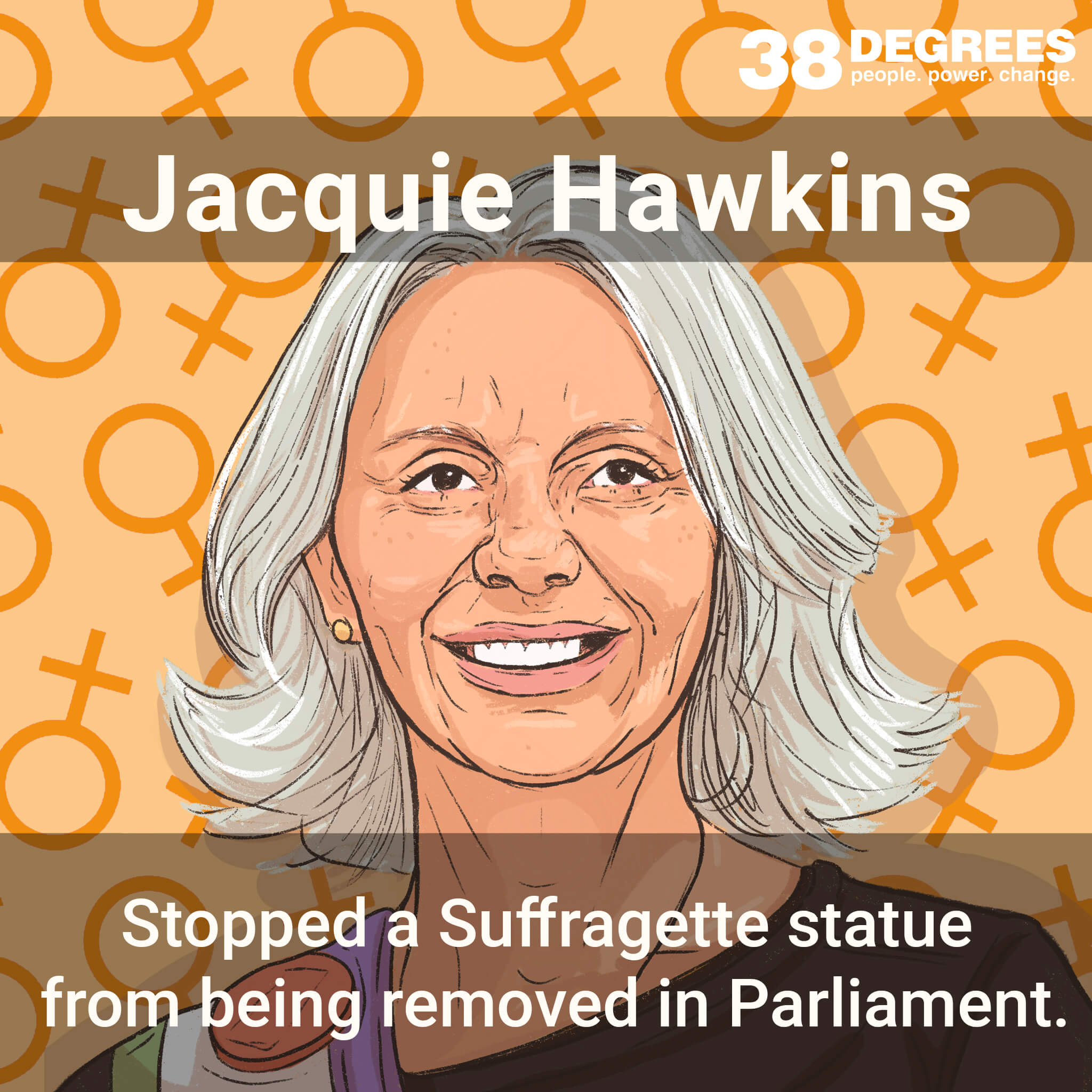 Image shows Jackie Hawkins. Text on the image says "stopped a Suffragette statue from being removed in Parliament".
