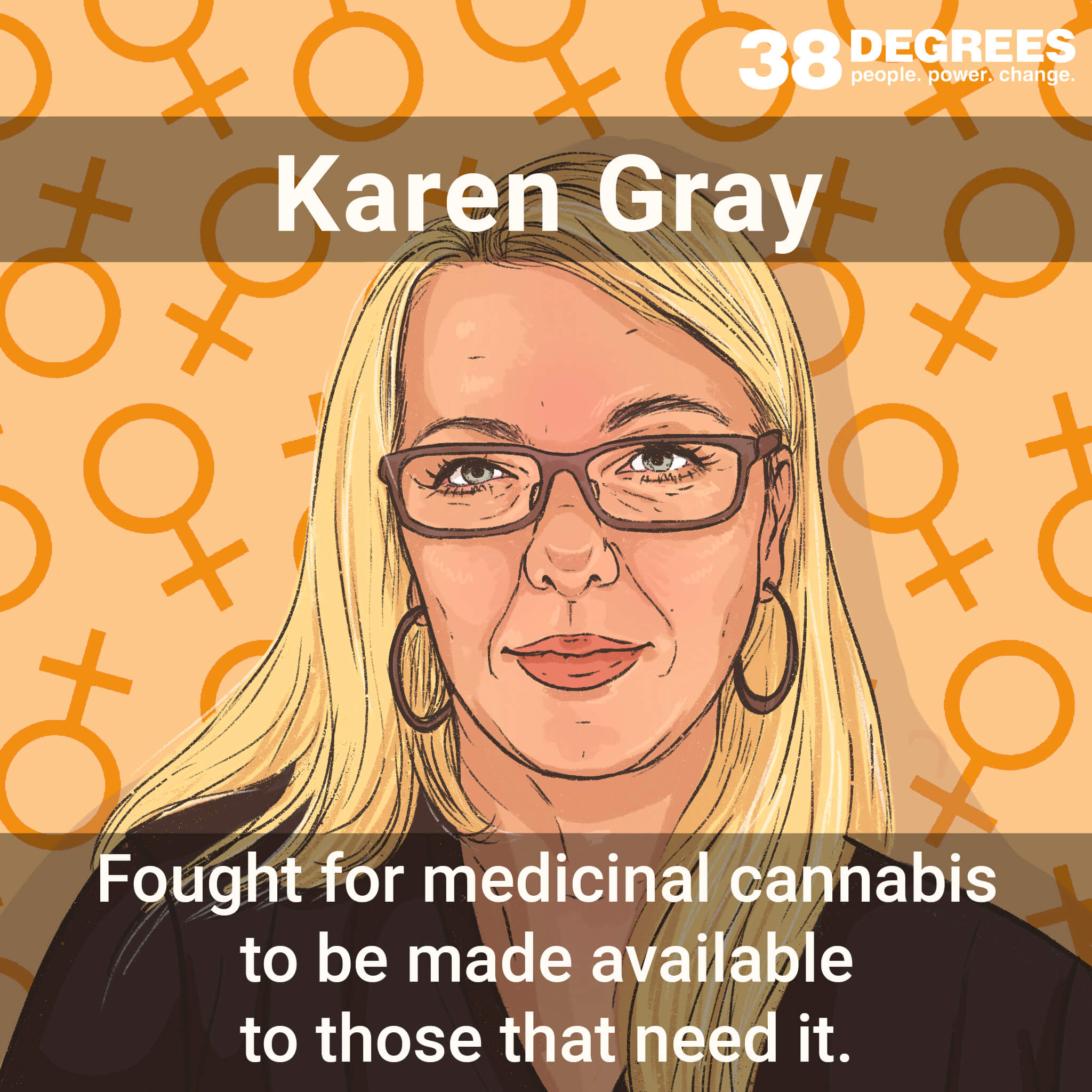 Image shows Karen Gray. Text on the image says "fought for medical cannabis to be made available to those that need it".