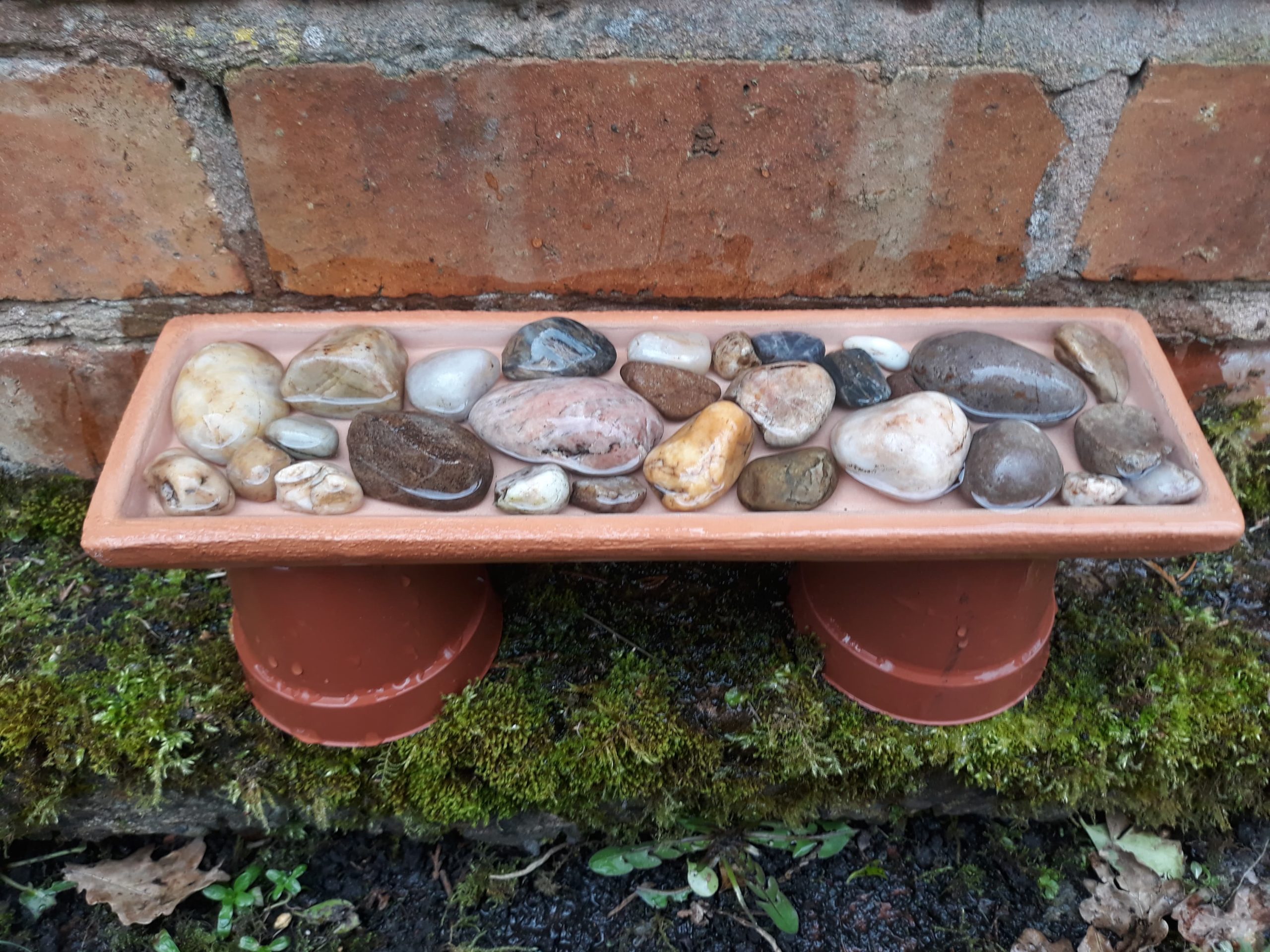 A shallow dish filled with clean stones is placed on top of two upturned plant pots. There is water in the dish.