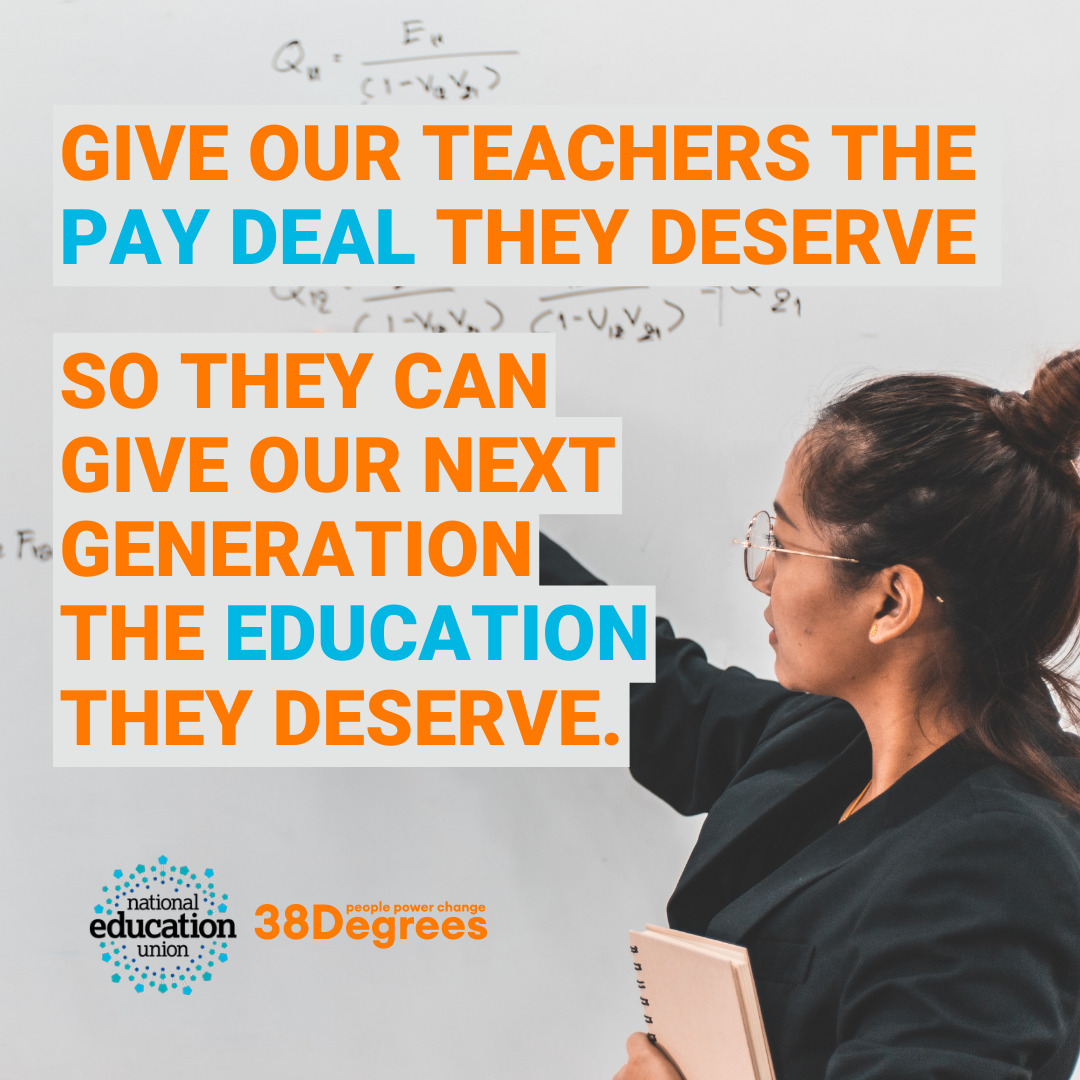 An image of a teacher writing on a board - orange and blue text over the image says "give our teacher the pay deal the deserve so they can give our next generation the education they deserve.