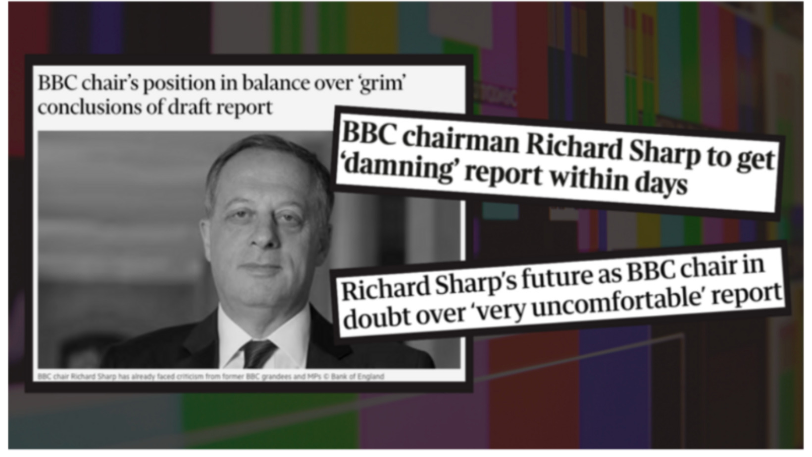 A black and white image of BBC boss Richard Sharp alongside headlines about investigations into him