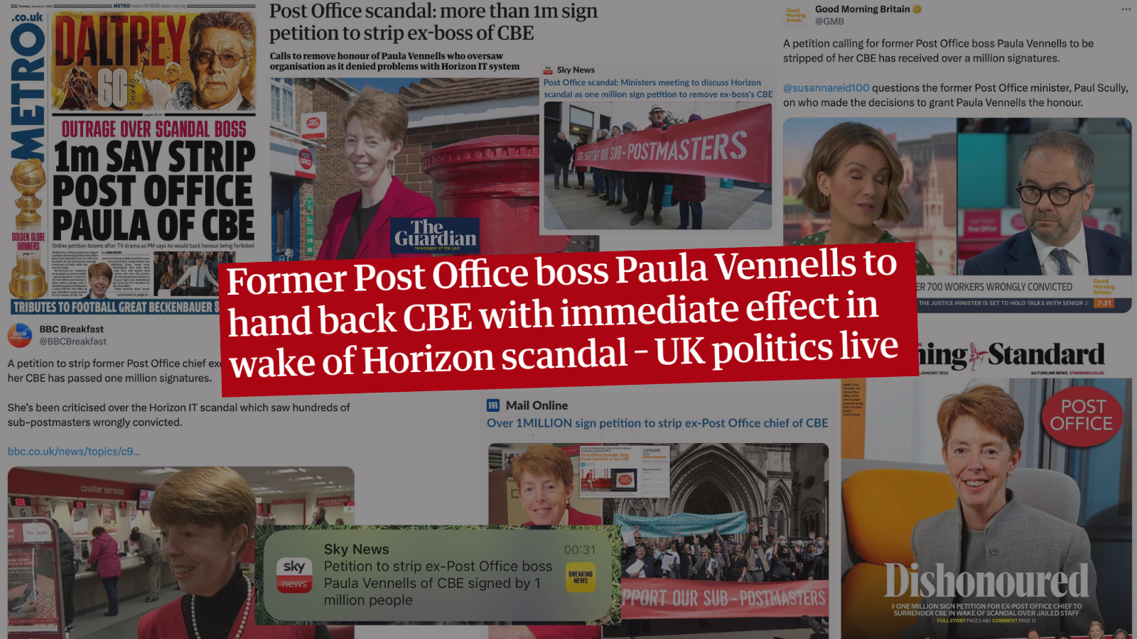 A series of newspaper headlines covered by a title saying that Paula Vennells has vowed to hand back her CBE
