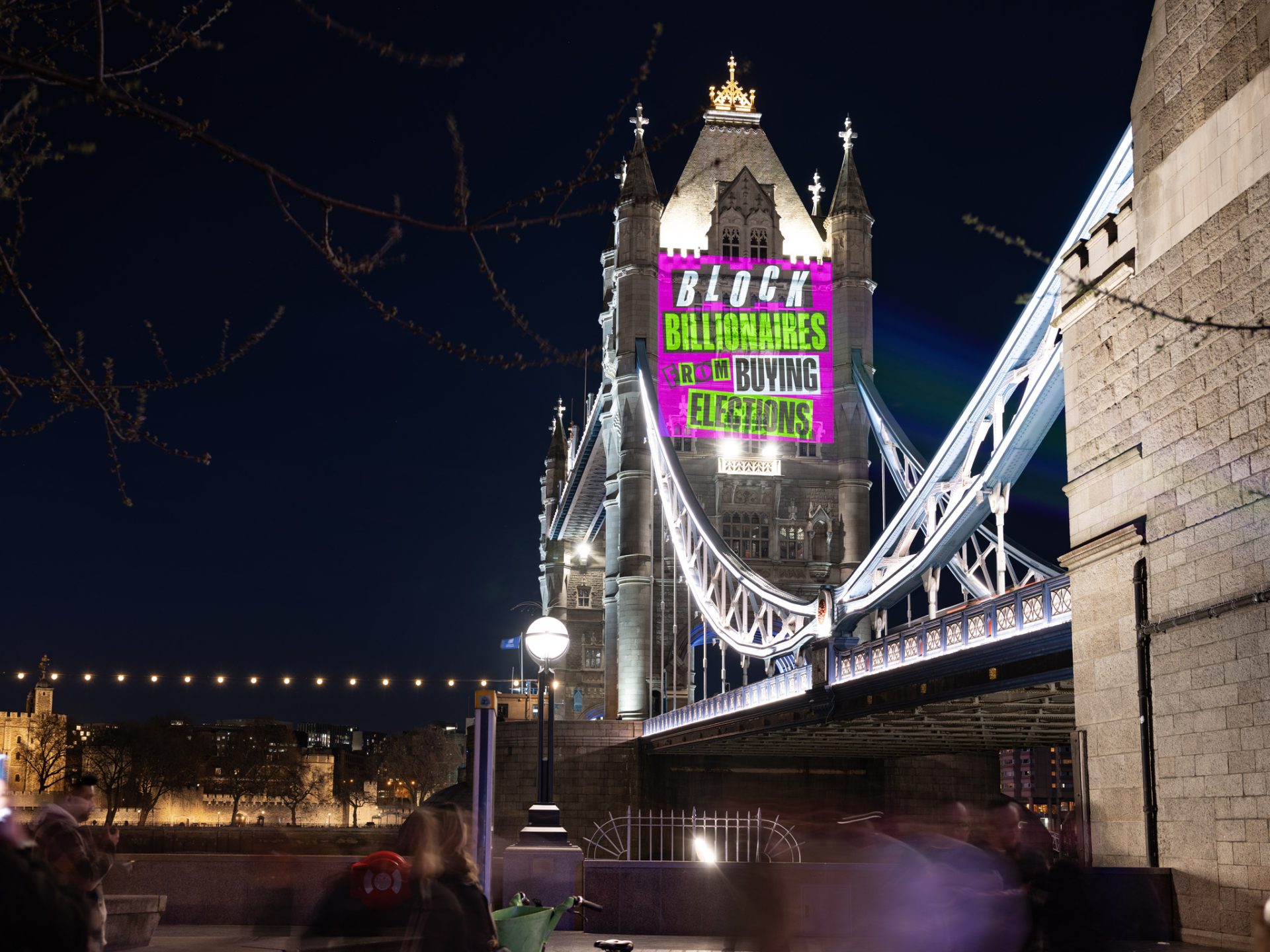 We lit up London’s most iconic landmarks – from Parliament to Tower Bridge – with a message that Elon Musk and Parliament can’t ignore: our democracy is not for sale. Thanks to 4,148 people chipping in to make it happen, we sent our message loud and clear to the richest person in the world, and got it splashed across the media.