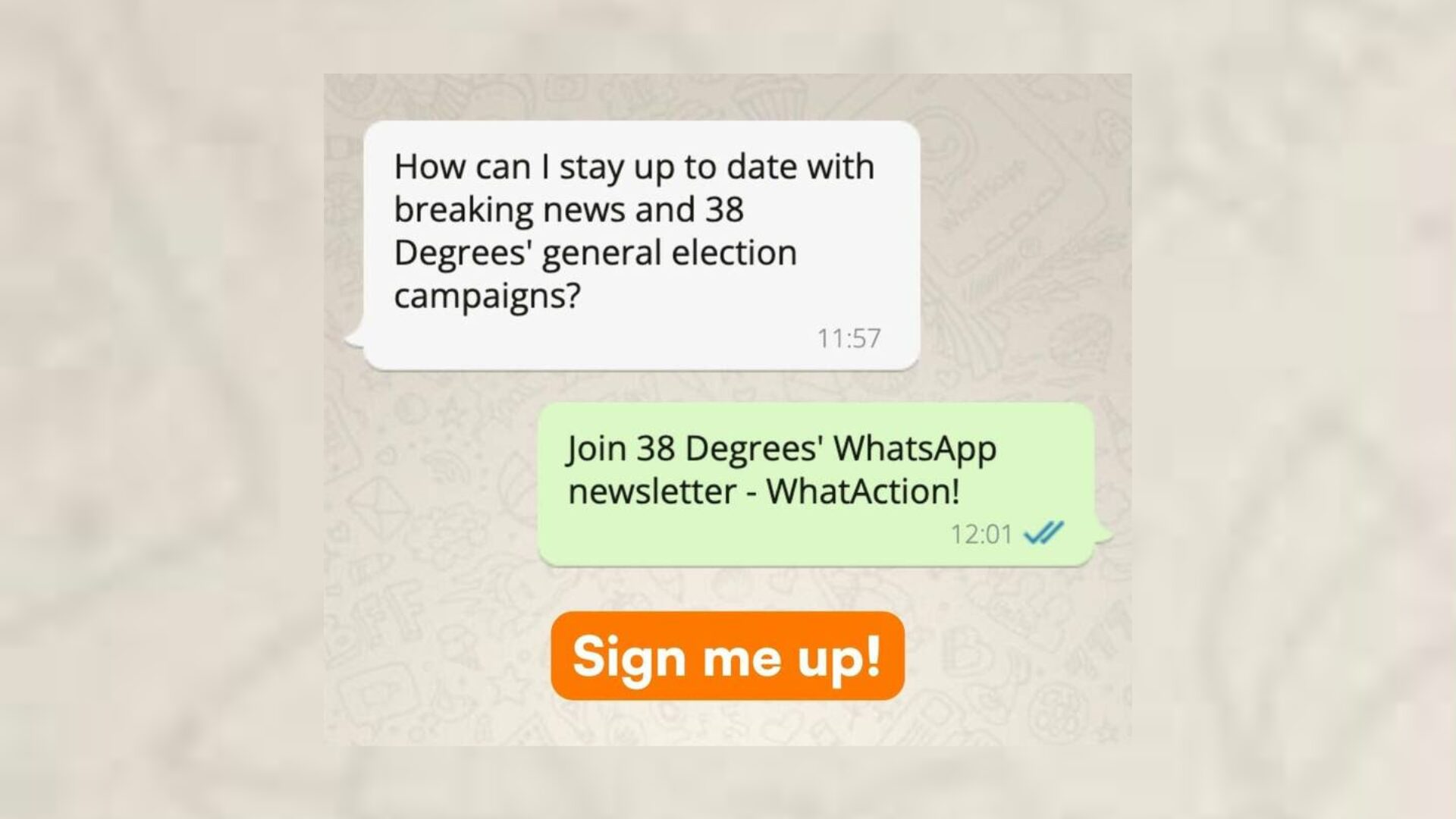 We invite you to join our WhatsApp newsletter: WhatAction with 38 Degrees. By signing up, you’ll be the first to hear breaking news and how you can make change.