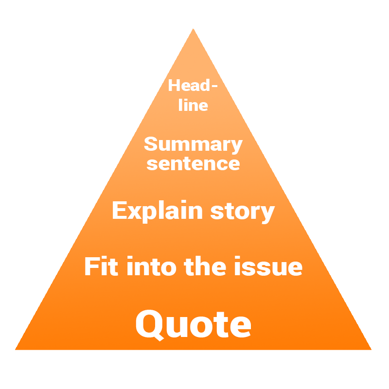 Pyramid which is smaller at the top and wider at the base. From the top down, it reads: "Headline, summary sentence, explain story, fit into the issue, quote".