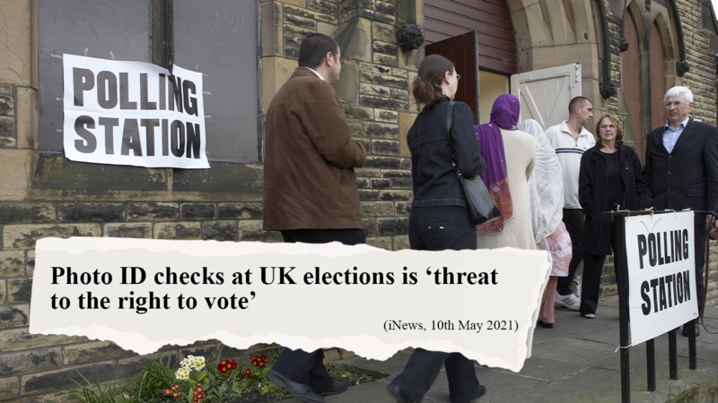 Image shows voters outside a polling station. Text on the image says "Photo ID checks at UK Elections is 'threat to right to vote'".